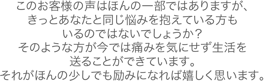 60歳になってくると痛いところを我慢したり、この状態が普通と諦めていたが、施術を受けなかったらどんなふうになっていたかと思うと不安になる。今は元気活発な生活が送れているので、似たような悩みがある方は一度施術を受けてみることをおすすめします。