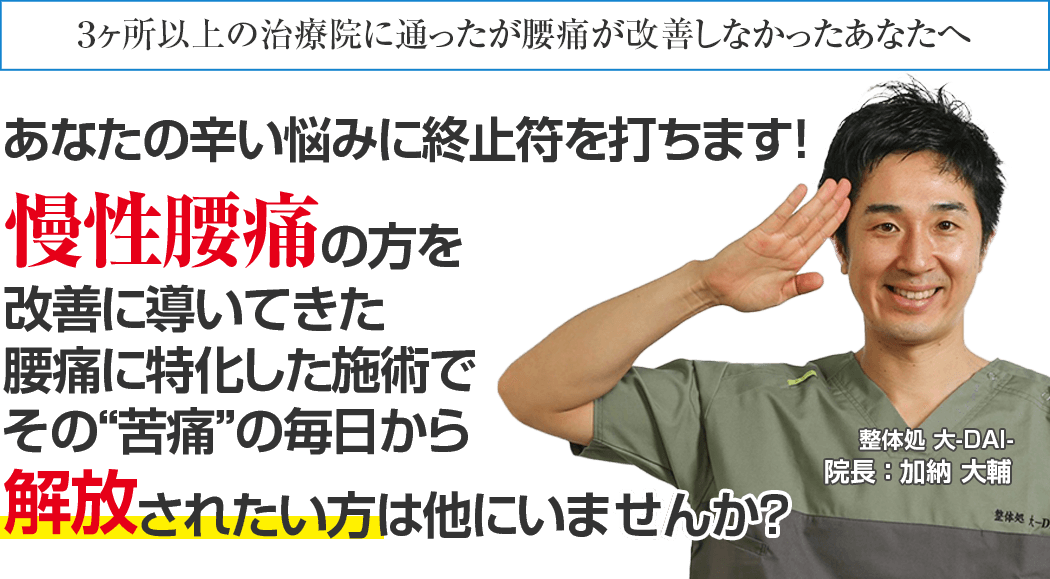 国家資格を持ち、述べ1万5千人以上を施術した臨床経験から、あなたの症状に真っ向から向き合ってくれる坂井市で唯一の腰痛専門整体処大に来院し、もう二度とその腰痛を我慢することのない人生を手に入れる道。
